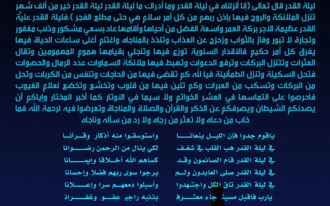 قال تعالى (إنا أنزلناه في ليلة القدر وما أدراك ما ليلة القدر ليلة القدر خير من ألف شهر تنزل الملائكة والروح فيها بإذن ربهم من كل أمر سلام هي حتى مطلع الفجر ).فليلة القدر عليَّة القدر عظيمة الأجر بركة العمر واسعة الفضل من أحياها وأقامها عاد بسعي مشكور وذنب مغفور وتجارة لا تبور وفاز بالثواب وزحزح عن العذاب وتلذذ بالمناجاه واغتنم أغلى ساعات الحياة فيها يفرق كل أمر حكيم فالأقدار السنوية توزع فيها وتنجلي بقيامها هموم المهمومين وتقال العثرات وتتنزل البركات وترفع الدعوات وتهبط فيها ملائكة السماوات عدد الرمال والحصوات فتحل السكينة وتنزل الطمأنينة فيا لله كم تقضى فيها من الحاجات وتنفس من الكربات وتحل من البركات وتسكب من العبرات وكم تلين فيها من قلوب وتخشع وتخضع لعلام الغيوب فاحرصوا على التماسها في العشر الخواتم ولا سيما في الأوتار كما أخبر المختار وإياكم أن يصدنكم الشيطان ويصرفكم عن الذكر والقرآن والصلاة والمناجاة وتعرضوا فيه لرحمة الله فما خاب من دعاه ولا تعثر من رجاه ولا رد من سأله وناجاه